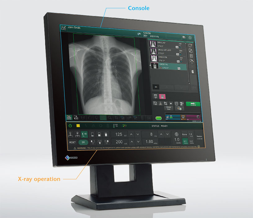 Dedektör Konsolu ve röntgen kumandası entegredir ve aynı monitörde görüntülenir. Aynı bilgisayardan pozlama koşulu ayarlanabilir ve pozlama menüsü seçilebilir.