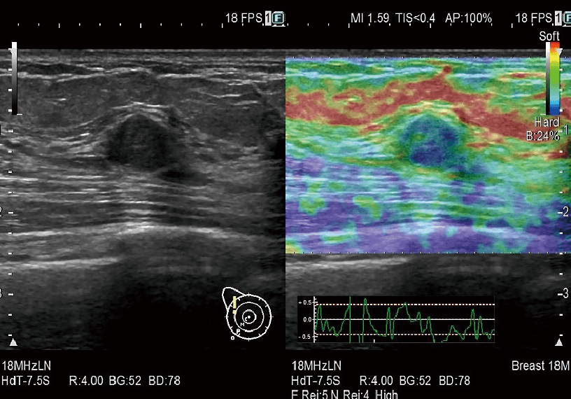 RTE, doku gerinimini gerçek zamanlı olarak değerlendirir ve doku sertliğini renk haritası olarak görüntüler. Uygulama, meme de dahil olmak üzere çok çeşitli klinik alanlarda doğrulanmıştır ve karaciğer fibroz evrelemesinin tahmini elastisite değerini hesaplamak mümkündür.
